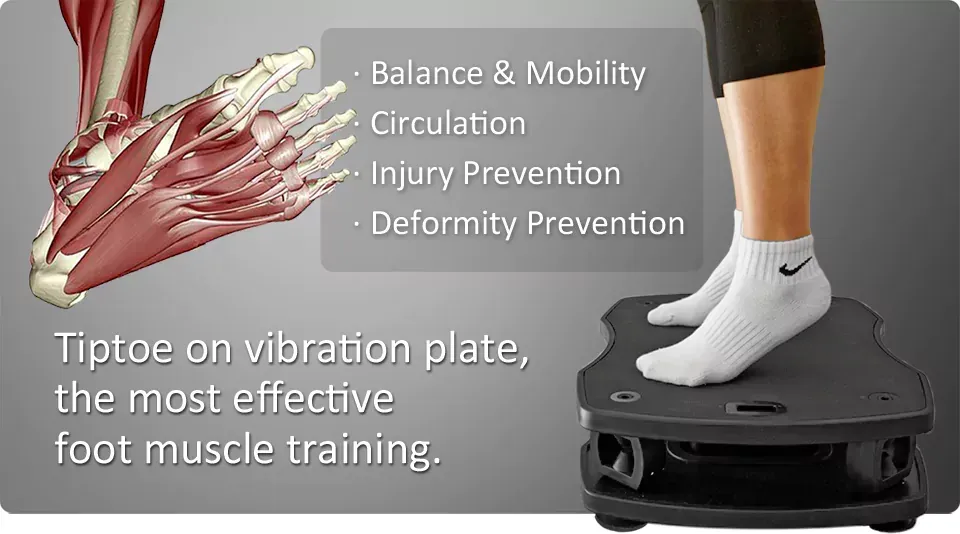 Many VT007 vibration plate users feedback that their foot nerve pain caused by diabetes or spinal problems is quickly relieved by performing calf-raise and squat exercises on the vibration plate.