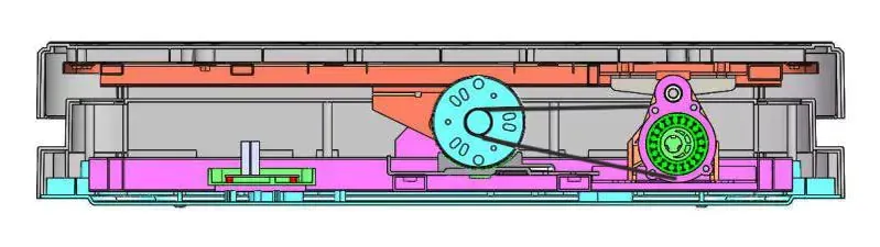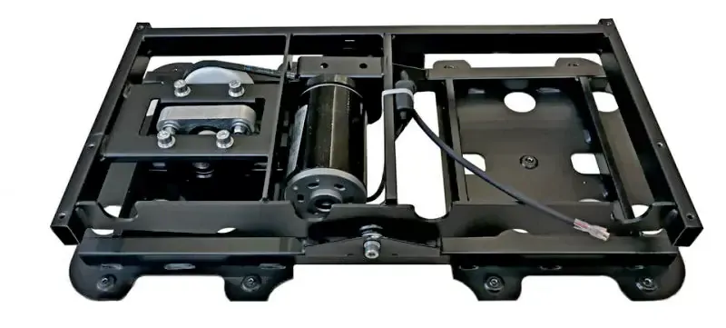 In a pivotal oscillation plate, the motor drives the crank-bar (red) via a belt. The crank-bar, designed with a circular shape, allows smooth rotation by the belt. This rotational motion is transmitted to the coupler-bar (green) and the rocker-bar (blue). The exercise platform is mounted on the rocker-bar. As the crank-bar rotates, the coupler-bar moves the rocker-bar, causing the exercise platform to oscillate in a seesaw motion.